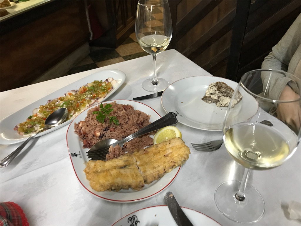 私たちがこのレストランで頼んだのは、タコのカルパッチョと、タコ飯とタコのフライが載ったプレート。タコ尽くしです笑。ハウスワイン(白)のハーフボトルも一緒に。